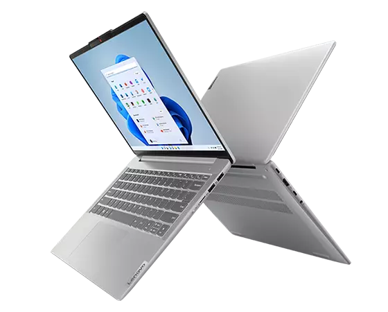 Back-to-back 14-inch Lenovo IdeaPad Slim 5 AMD laptops open 90 degrees and forming an ‘X’ with keyboard and display showing on front facing device.