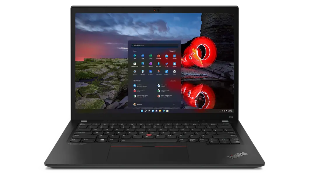 Lenovo ThinkPad X13 Gen 2 (13" AMD) laptop – ¾ right-front view, with lid open and image of seascape with red and white motion blurs on the display