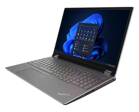 Side--facing Lenovo ThinkPad P16 Gen 2 (16″ Intel) laptop, opened, showing display, Windows 11 screen, keyboard & right-side ports