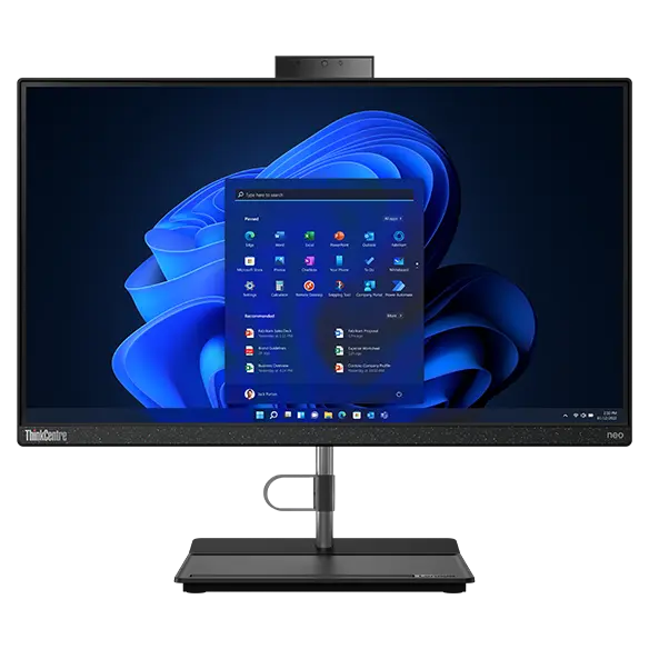 ThinkCentre Neo 30a (22" Intel) all-in-one business PC viewed eye-level from front-right corner, with pop-up webcam visible.