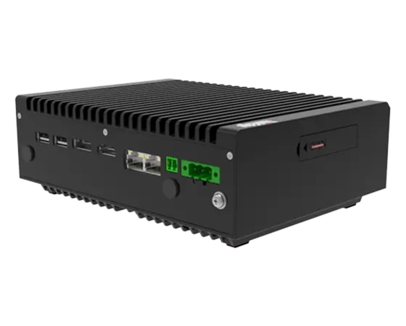 Client Edge Lenovo ThinkEdge SE10-I incliné pour montrer le port côté gauche ainsi que les ports et les emplacements avant.