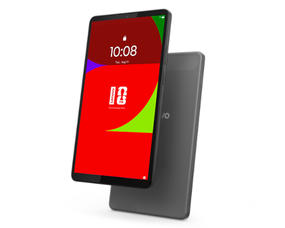 Deux tablettes Lenovo Tab One - vue de face droite avec écran de verrouillage sur l'écran, devant une vue arrière gauche, toutes deux Luna Grey et orientées verticalement.