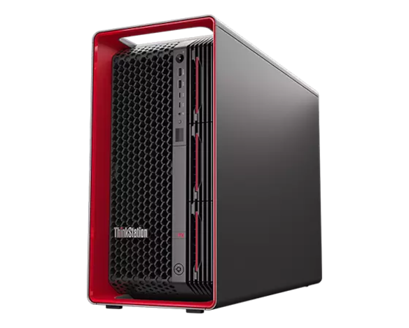 Station de travail Lenovo ThinkStation PX orientée latéralement, présentant les composants rouges emblématiques ThinkPad, les ports avant et le panneau latéral gauche