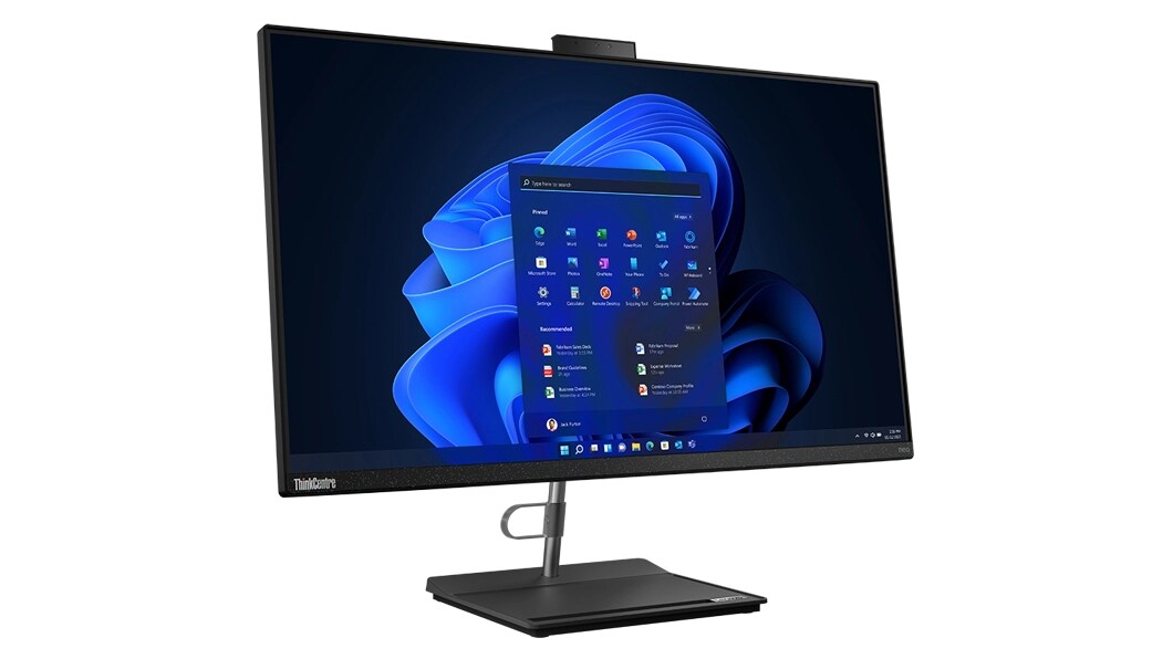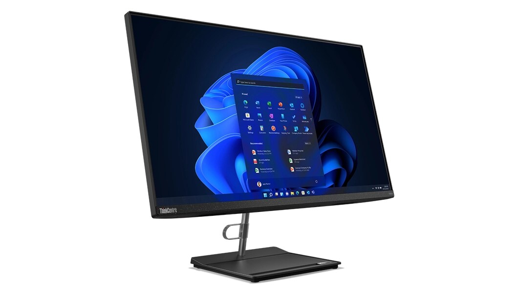Side-facing ThinkCentre Neo 30a  (27" Intel) all-in-one PC, showing display with Windows 11 start-up & monitor stand