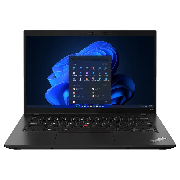 Lenovo ThinkPad L14 Gen 4 (14” AMD) laptop – front view, lid open with search window over blue wavy background