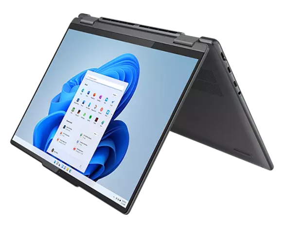 Two Yoga 7 Gen 8 (14'' AMD) devices back-to-back, one in laptop mode and one in tent mode