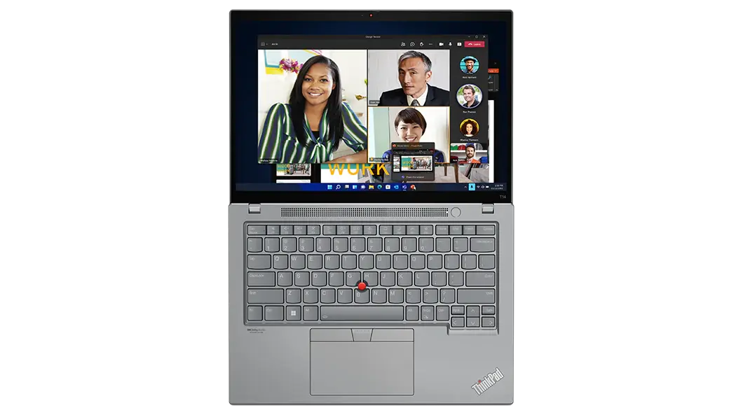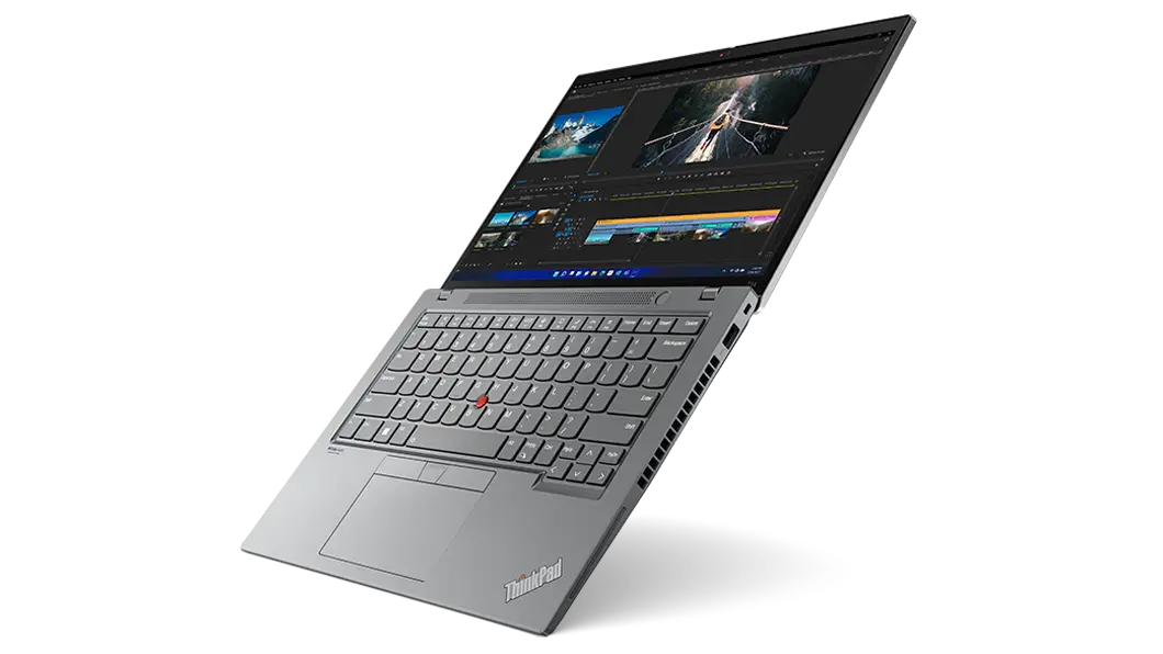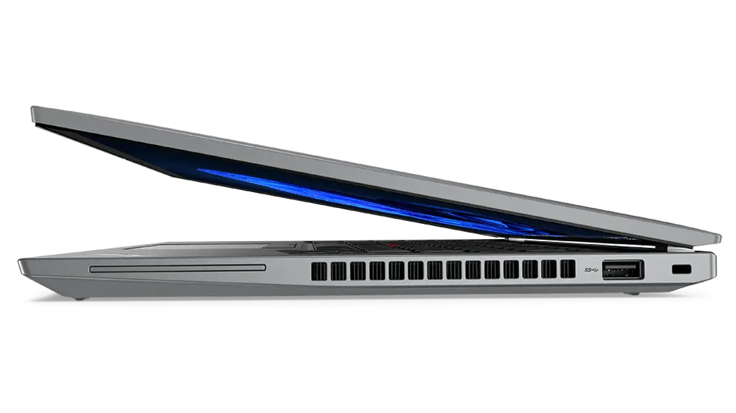 Front-facing, right-side view of ThinkPad T14 Gen 3 (14 AMD), opened, showing display and keyboard