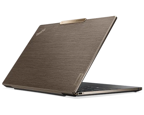 Lenovo ThinkPad Z13 Gen 2 13 inch laptop open 90 degrees with Windows 11 Pro menu on the display, & angled to show right-side ports.