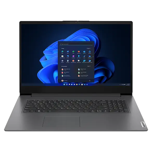 Front facing Lenovo V17 Gen 3 laptop, showing keyboard & display (with Windows 11 start-up menu)