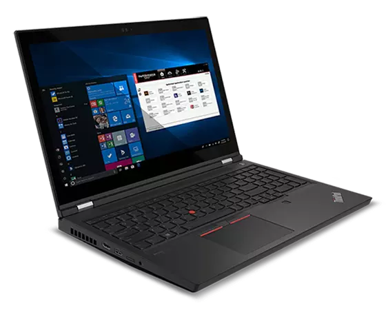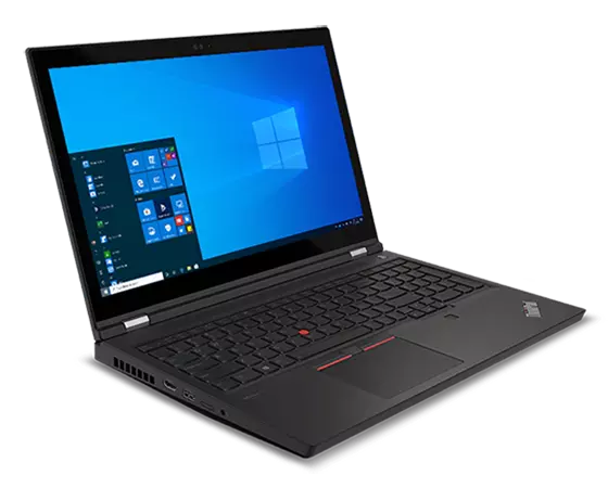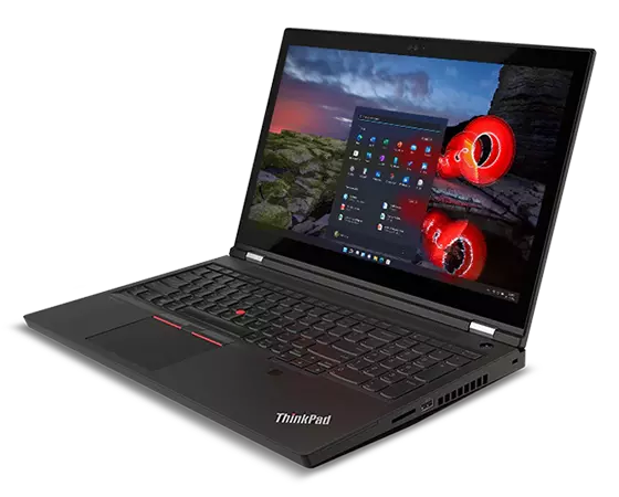 Den mobile Lenovo ThinkPad P15 Gen 2-workstation åbnet 90 grader vinklet en smule for at vise porte i højre side, tastatur og skærm med en stor rød farveklat.
