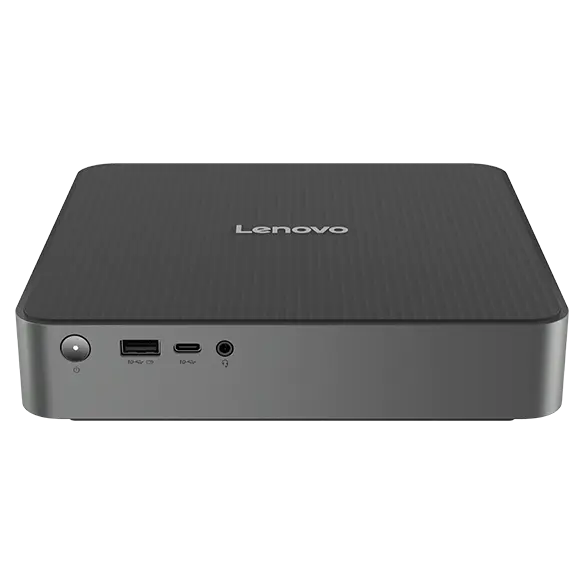 Front view, showing ports and power button, of the IdeaCentre Mini x Gen 10 (Snapdragon).