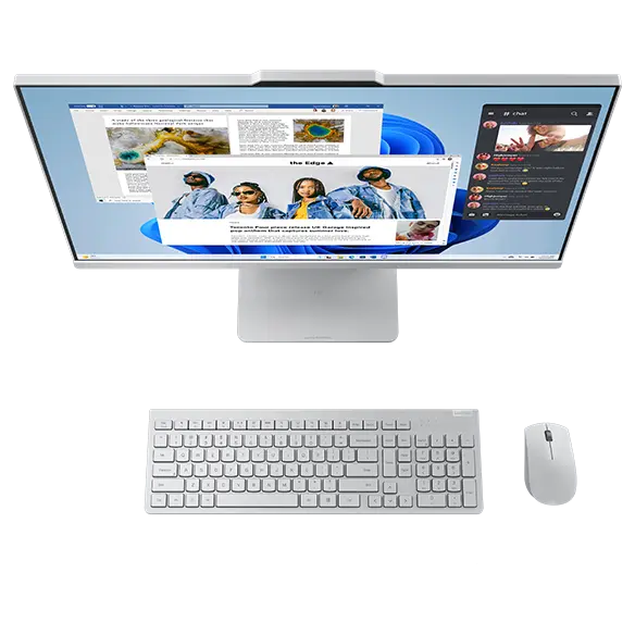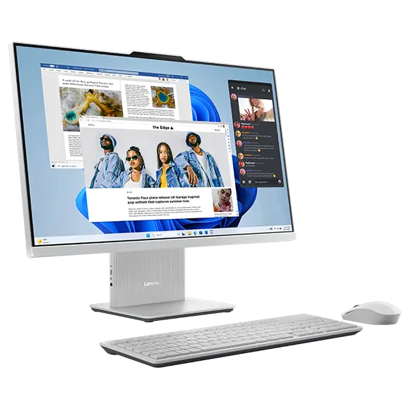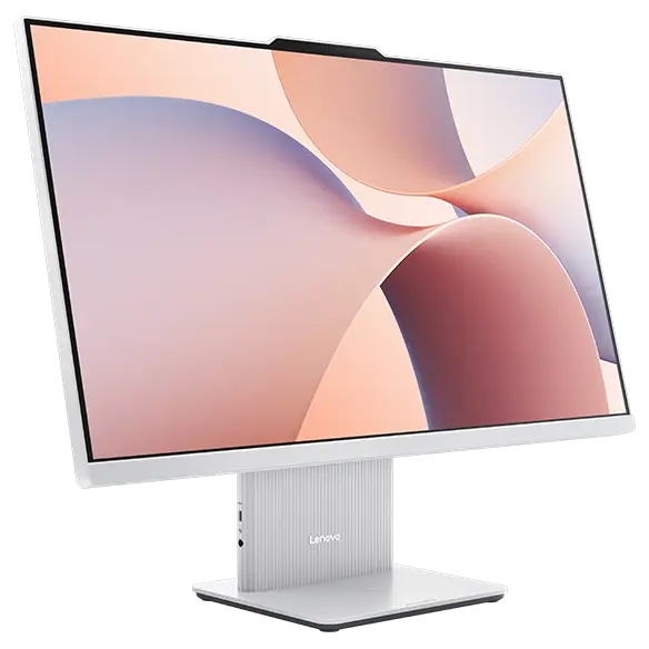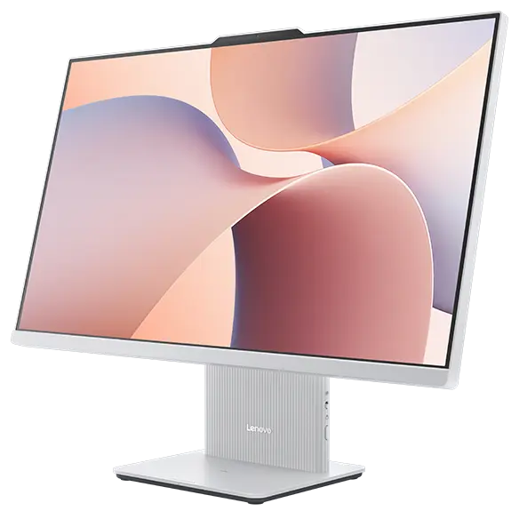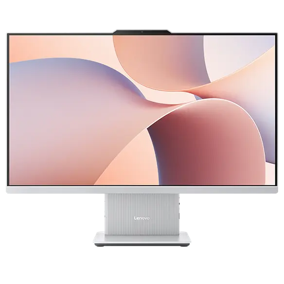 Lenovo IdeaCentre AIO Gen 10 (27'' AMD) -all-in-one-tietokone Cloud Grey -värisenä – edestä katsottuna, näytöllä punaisen, sinisen ja violetin sävyissä liukuvia aaltokuvioita