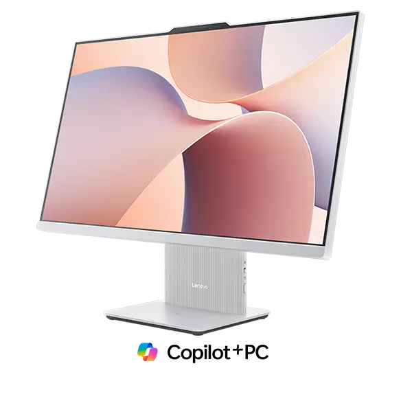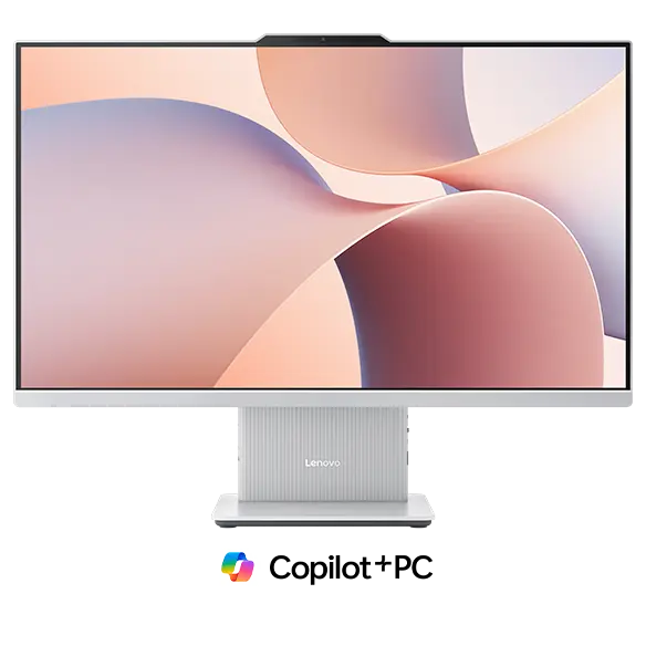Cloud Grey -värinen Lenovo IdeaCentre AIO Gen 10 (27" AMD) -all-in-one-tietokone Copilot+. – edestä kuvattuna, näytöllä punaisen, sinisen ja violetin sävyissä liukuvia aaltokuvioita