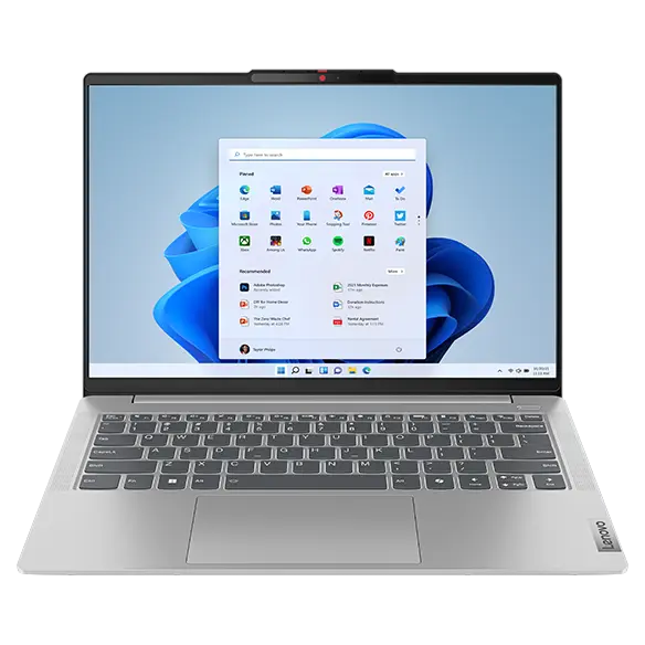 Lenovo IdeaPad Slim 5i Gen 9 (14" Intel) laptop – Cloud Grey – front view, lid open, Windows menu on the display