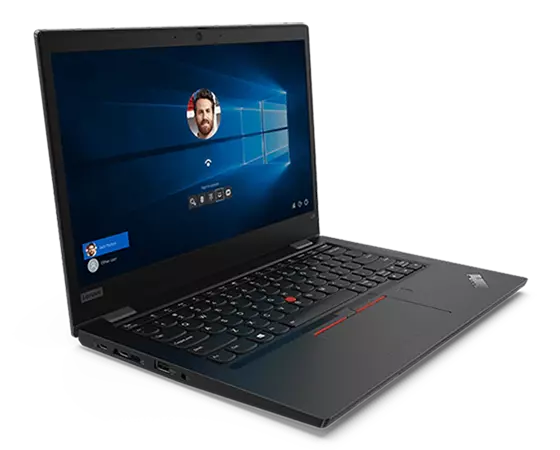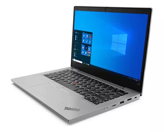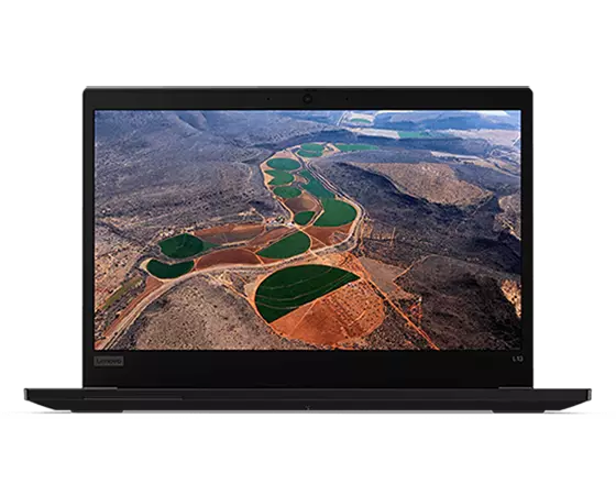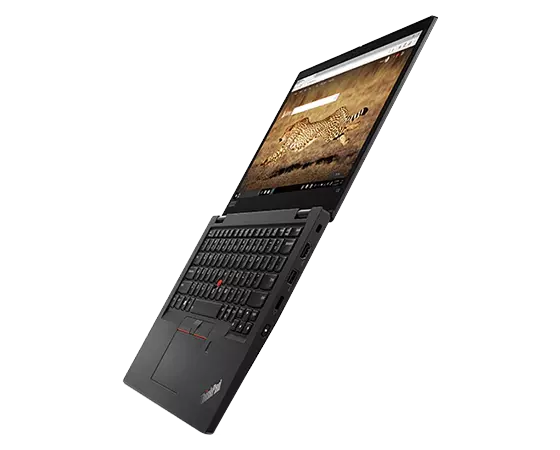 Front-right angle view of the ThinkPad L13 Gen 2 (13” AMD) laptop showing a colorful abstract linear design on the display