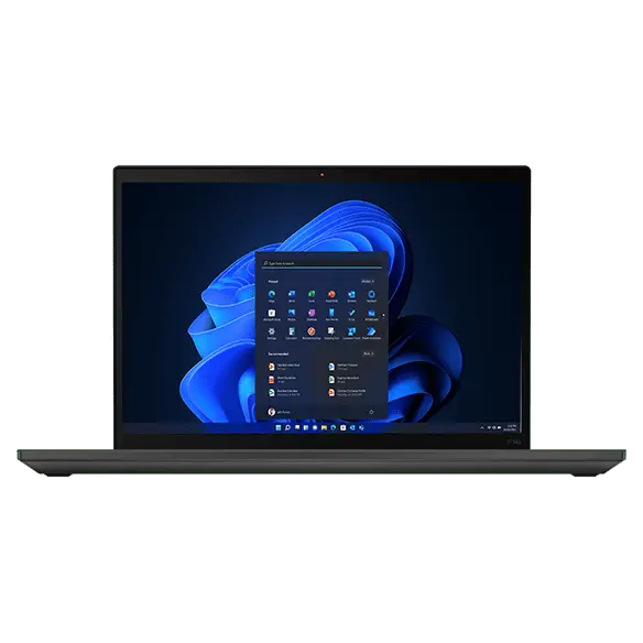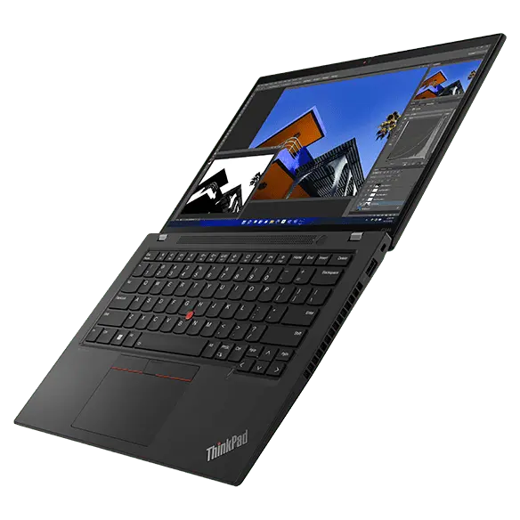 Front-facing Lenovo ThinkPad P14s Gen 3 (14'' AMD) laptop open 90 degrees & angled to show right-side ports.
