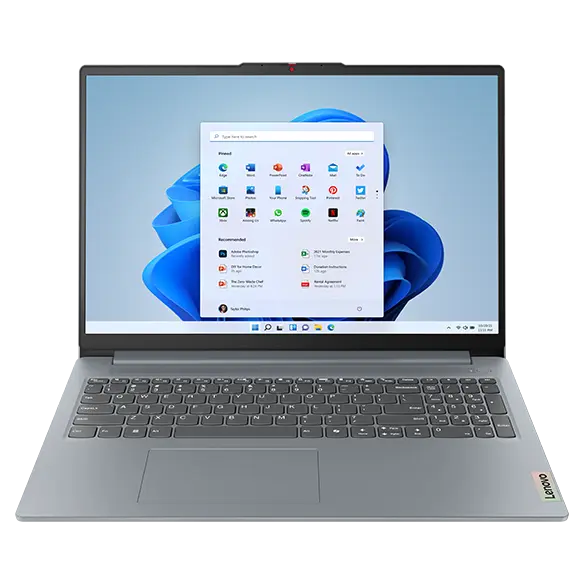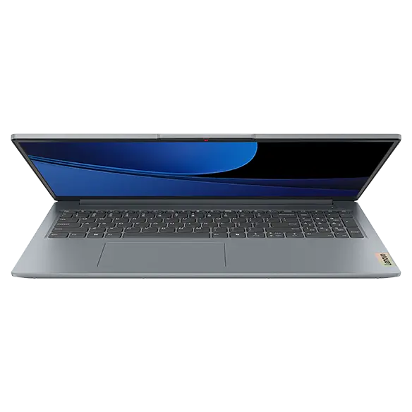 Front view of the Lenovo IdeaPad Slim 3i Gen 9 16 inch laptop in Artic Grey with lid opened 90 degrees, focusing its keyboard & Windows 11 Pro menu on the display.