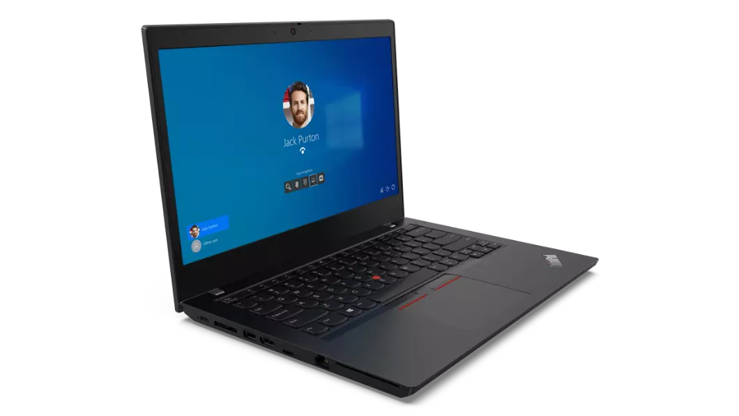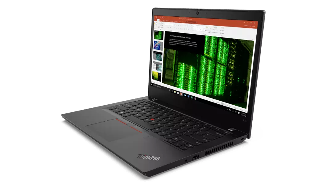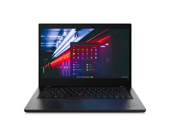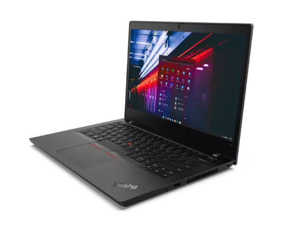 Lenovo ThinkPad L14 Gen 2 (14” AMD) laptop—3/4 right-front view with lid open and display showing image of seaside with red and white blurry lights in motion.