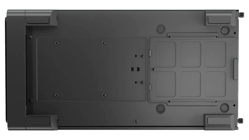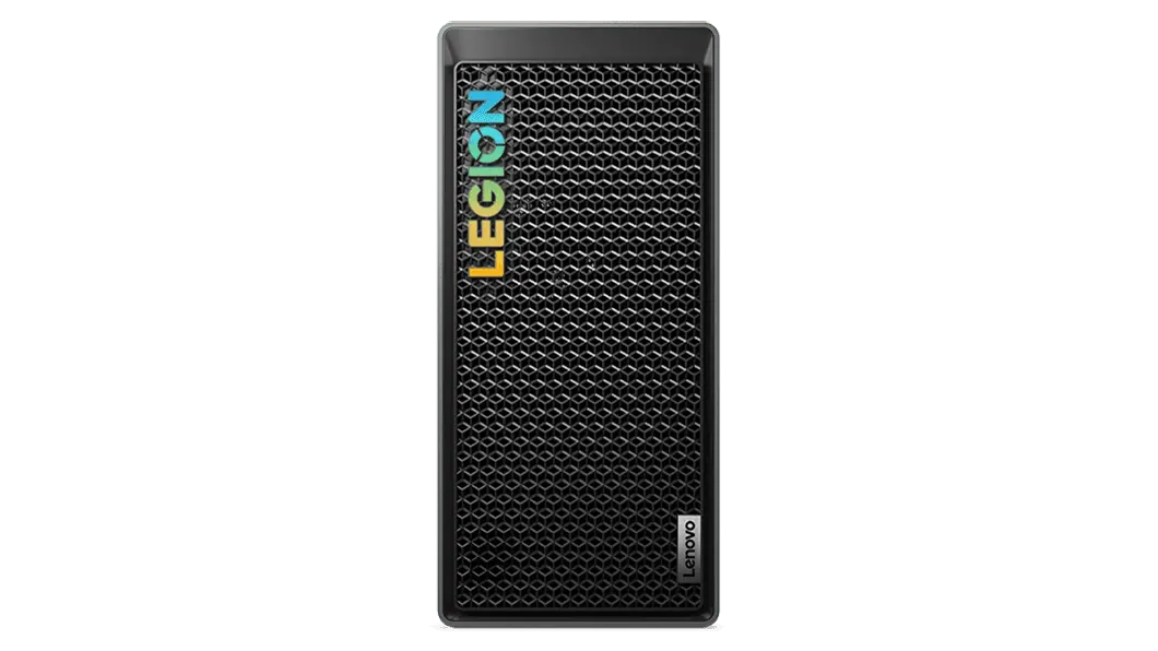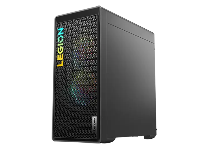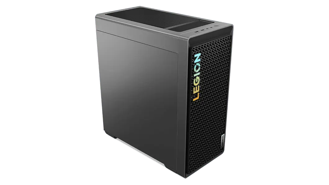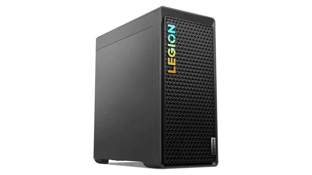 Front-right corner view of the Legion Tower 5 Gen 8 (AMD) gaming PC, viewed from low angle and revealing the mesh-vented front bezel and brightly lit Legion logo.