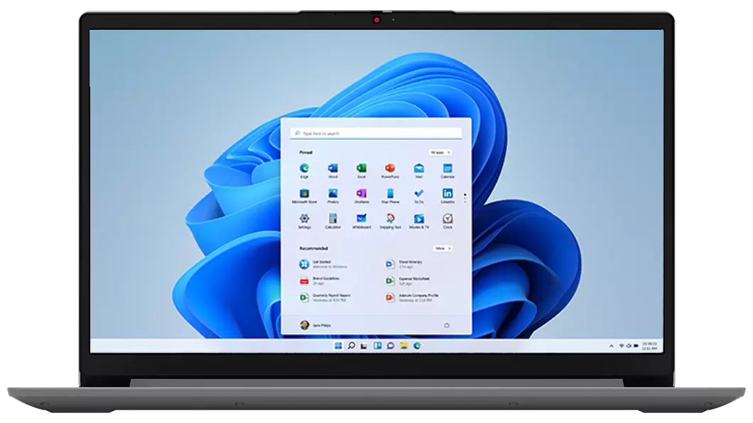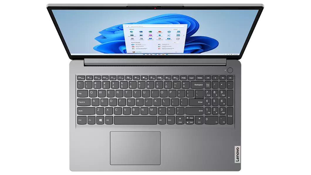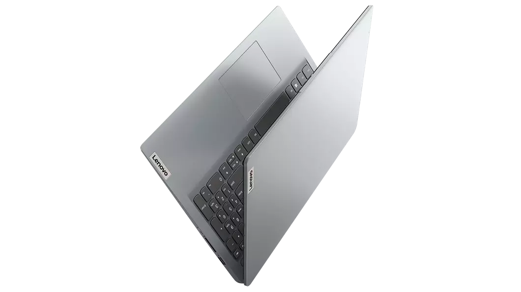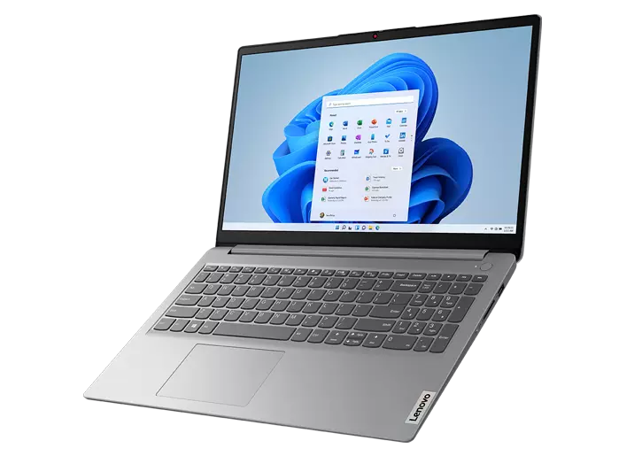 IdeaPad 1 Gen 7 (15, AMD) tilted and open, front facing left, Windows 11 home screen