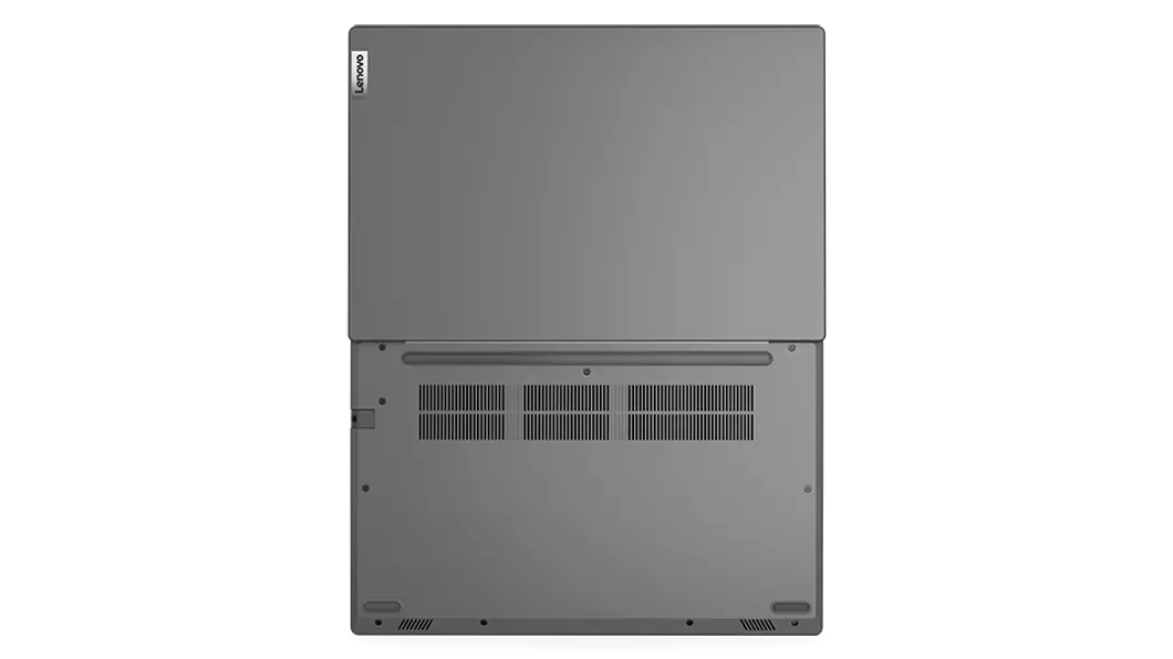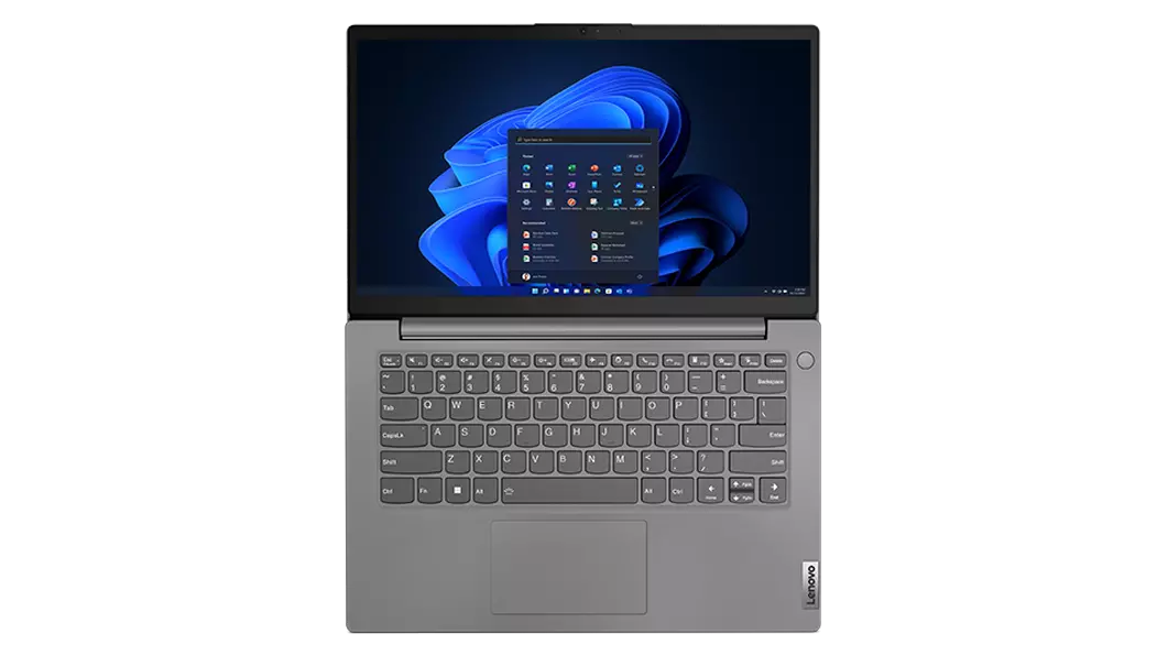 Right-side view from above of Lenovo V14 Gen 3 (14, intel) laptop, opened 90 degrees at a slight angle, showing keyboard and display with windows 11