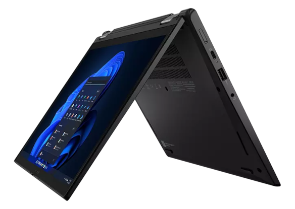 Lenovo Thinkpad L13 Yoga Gen4 laptop in Tent mode, angled to show left-side ports.