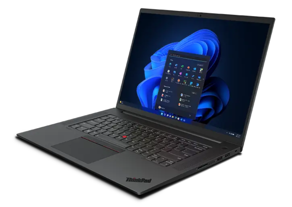 Forward-facing  Lenovo ThinkPad P1 Gen 6 (16, Intel) mobile workstation, opened at an angle, showing full keyboard, display with Windows 11 start-up screen, & right-side ports