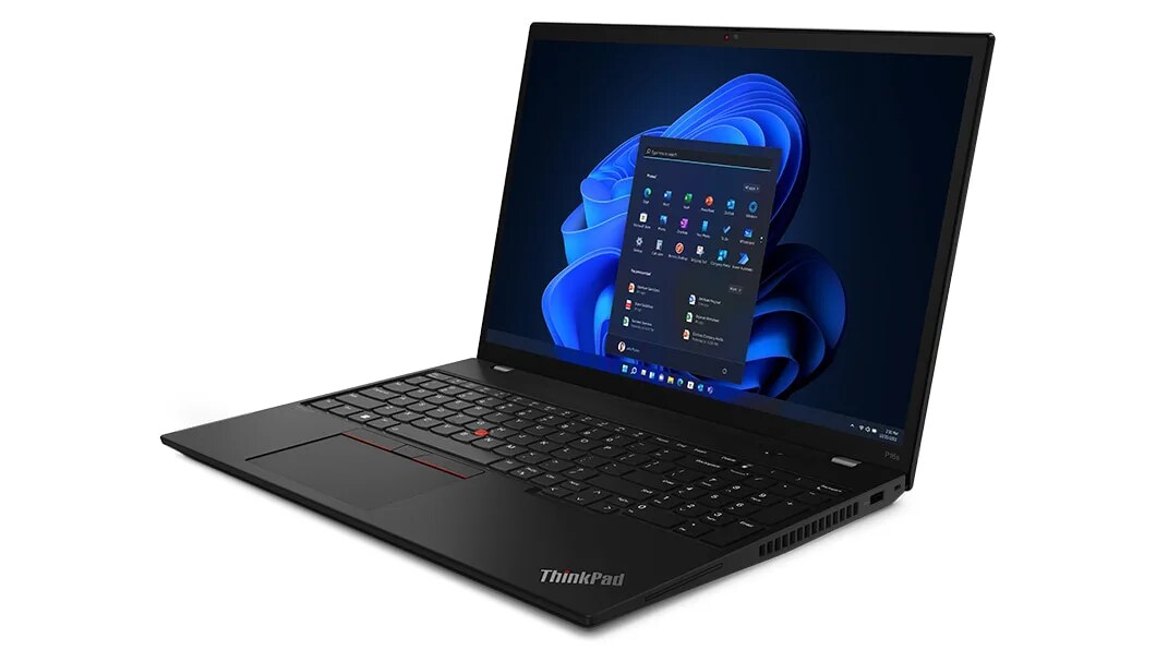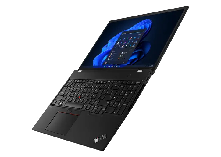 Side-facing Lenovo ThinkPad P16s Gen 2 (16, Intel) laptop, opened flat, floating at a 45-degree angle, showing display & keyboard