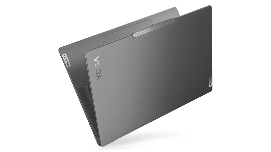 Top front right view of the Lenovo Yoga Pro 9i Gen 8 (14 Intel) open, adjacent to a back left view of the device closed