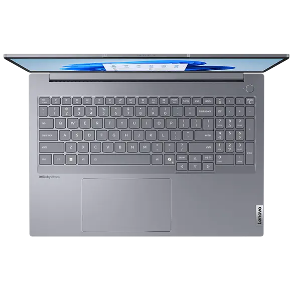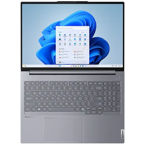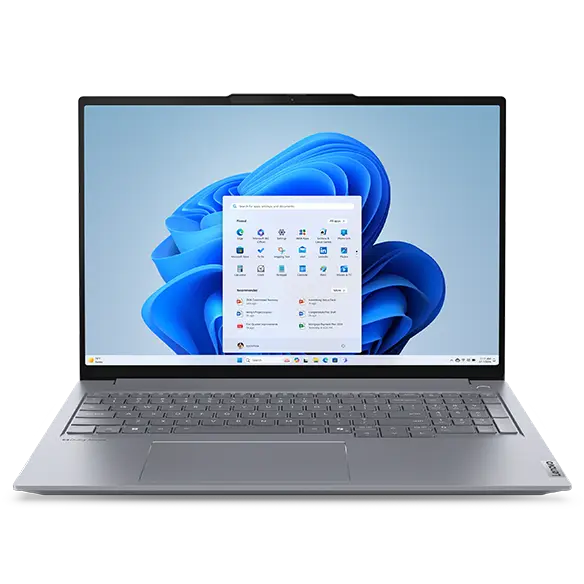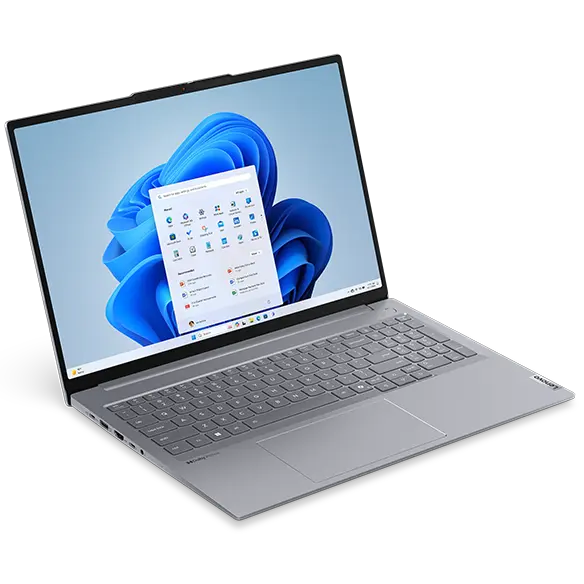 Close-up, front view of Lenovo ThinkBook 16 Gen 7 (16 inch AMD) laptop open, focusing its display with slim bezels, Windows 11 Pro menu & full high definition camera with privacy shutter & its keyboard layout.