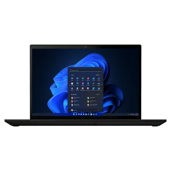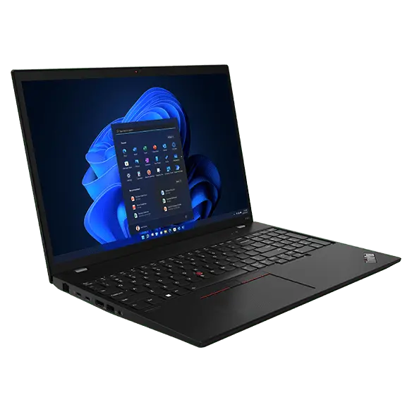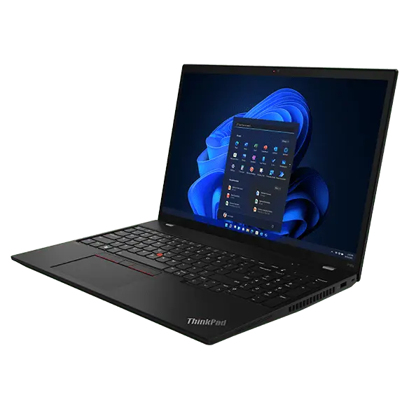 Side-facing Lenovo ThinkPad P16s Gen 2 (16″ Intel) laptop, opened flat, floating at a 45-degree angle, showing display & keyboard