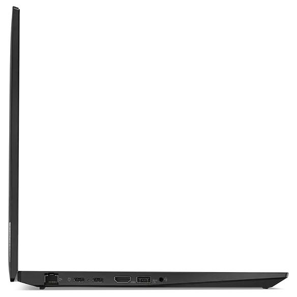Overhead shot of Lenovo ThinkPad T16 Gen 2(16ʺ AMD) laptop open 90 degrees, angled to show right-side ports, keyboard & display.