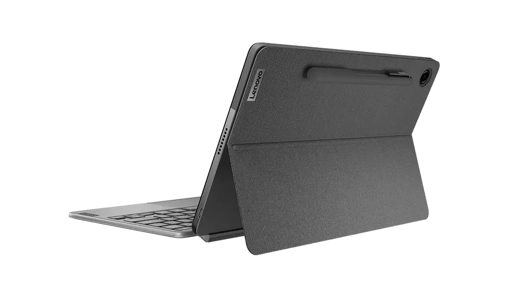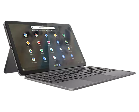 Two Lenovo Duet Chromebook Education Edition 2-in-1 Chromebooks back-to-back, showing detachable keyboard, display, & stand