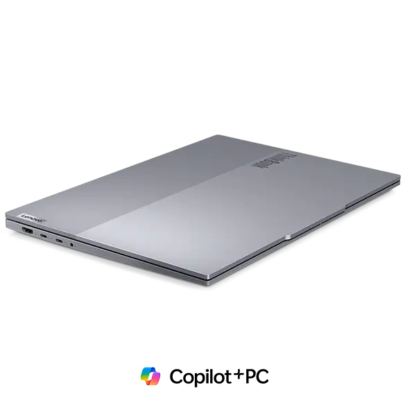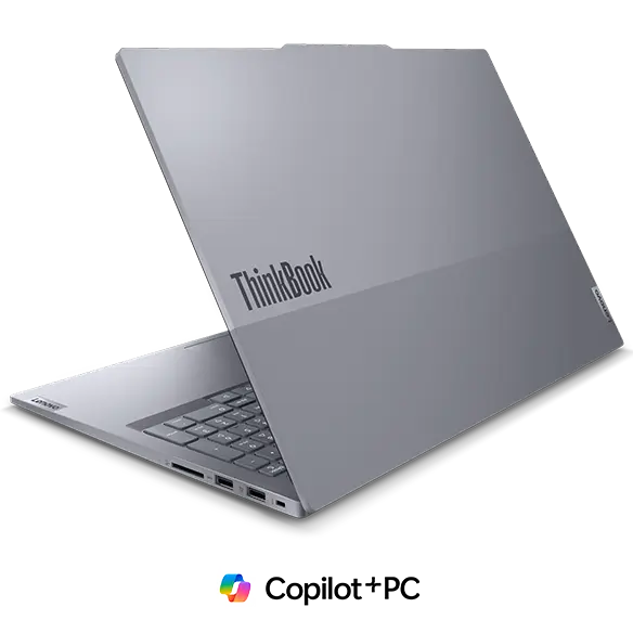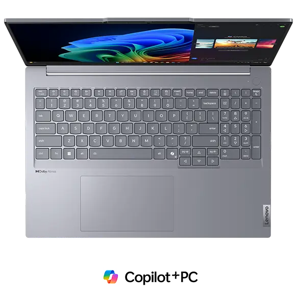 Close-up, front view of Lenovo ThinkBook 16 Gen 7 (16” Snapdragon) laptop opened 90 degrees, focusing its 16 inch wide screen with a Copilit’s window opened on screen & featuring its smooth keybord & touchpad.