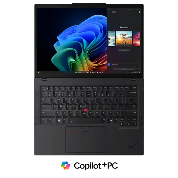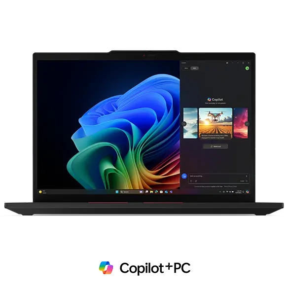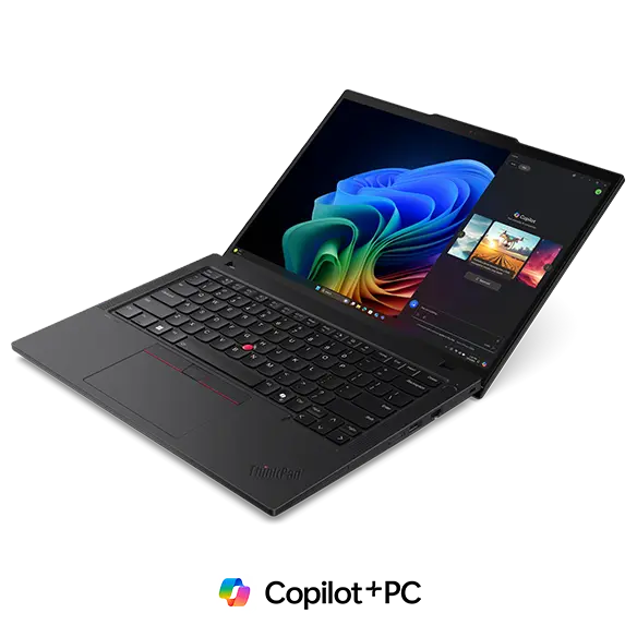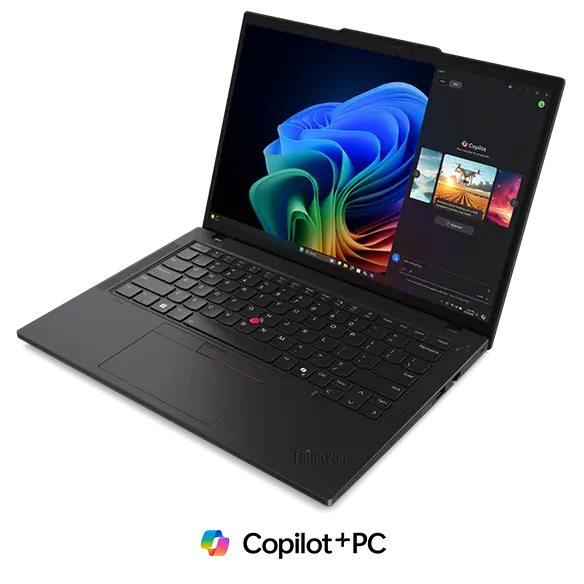 ThinkPad T14 Gen 6 (14" AMD) laptop, Eclipse Black – front view, lid open, with Copilot interface on the display against a Windows bloom desktop background