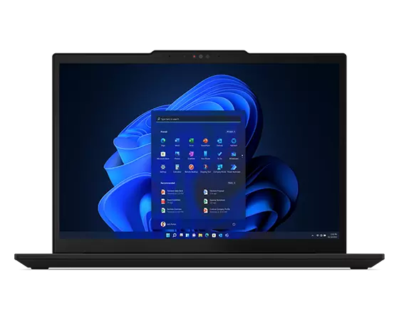 A front-facing ThinkPad X13 Gen 4 laptop open 90° to show off the keyboard and display
