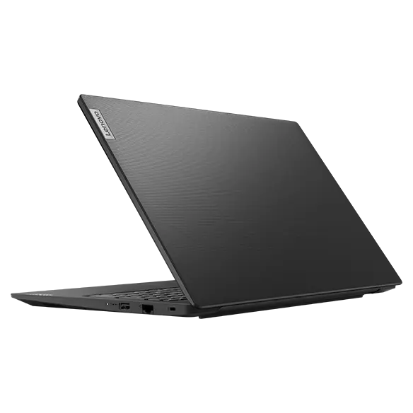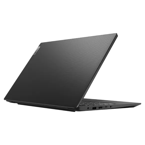 Front-facing Lenovo V15 Gen 4 15 inch laptop in Basic Black, showcasing keyboard & 15 inch display with Windows 11 Pro.