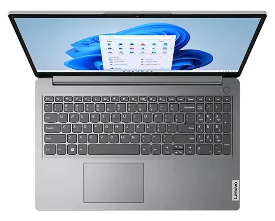 IdeaPad 1 Gen 7 (15'' AMD) tilted and open, front facing left, Windows 11 home screen