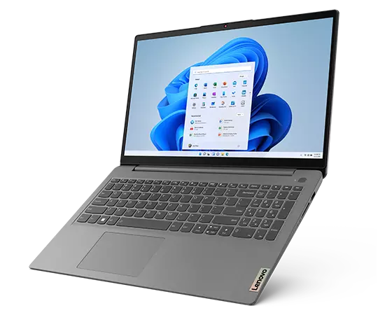 Arctic Grey IdeaPad 3i Gen 7 laptop tilted left, front-facing view
