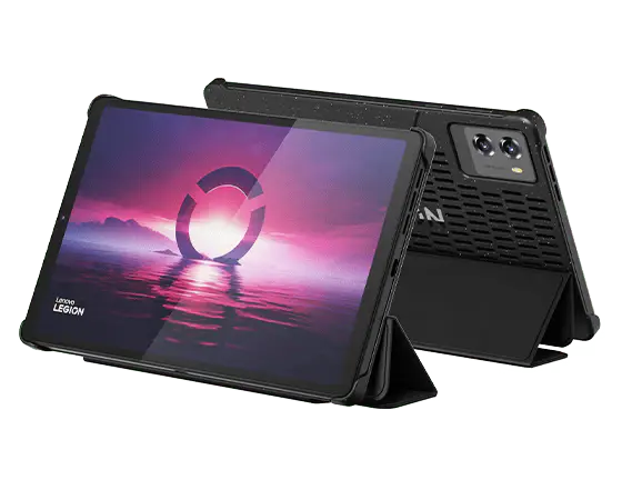 La Legion Tab Gen 3 de pie verticalmente orientada a la derecha con el logotipo de la Legion en pantalla.