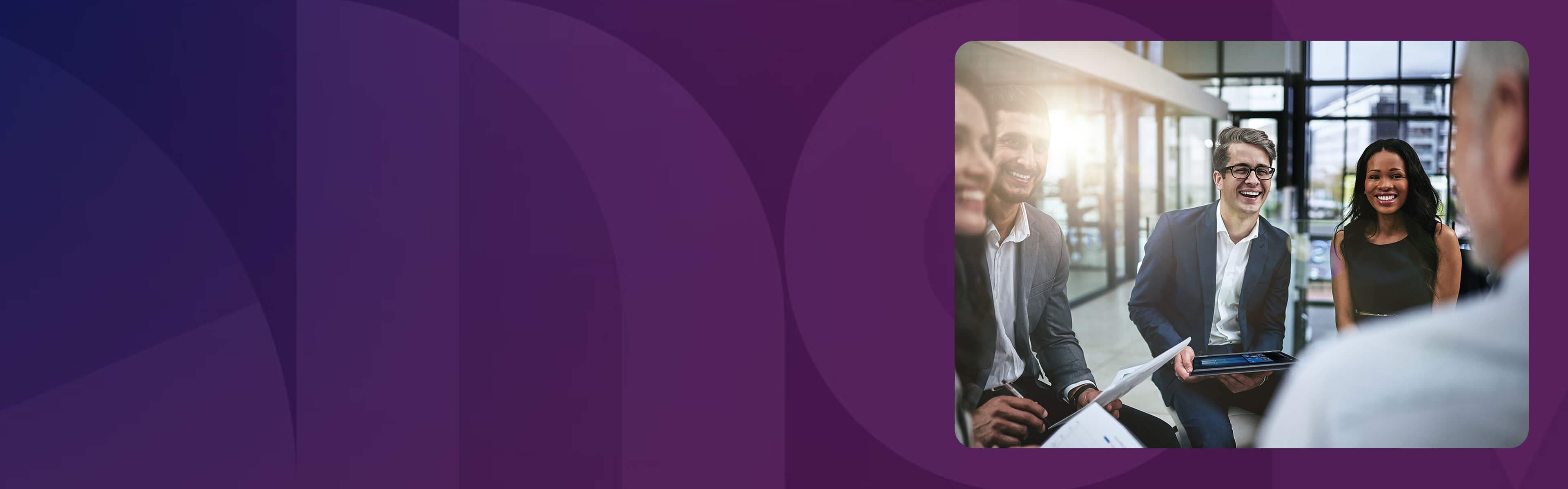 Cinco compañeros de trabajo riendo y sonriendo.