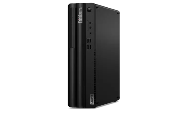 Front facing Lenovo ThinkCentre M90s Gen 2 small form factor positioned vertically, angled slightly to show right side.