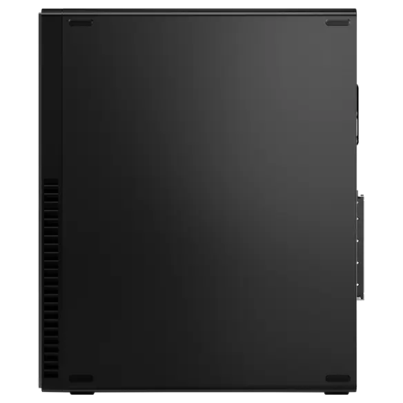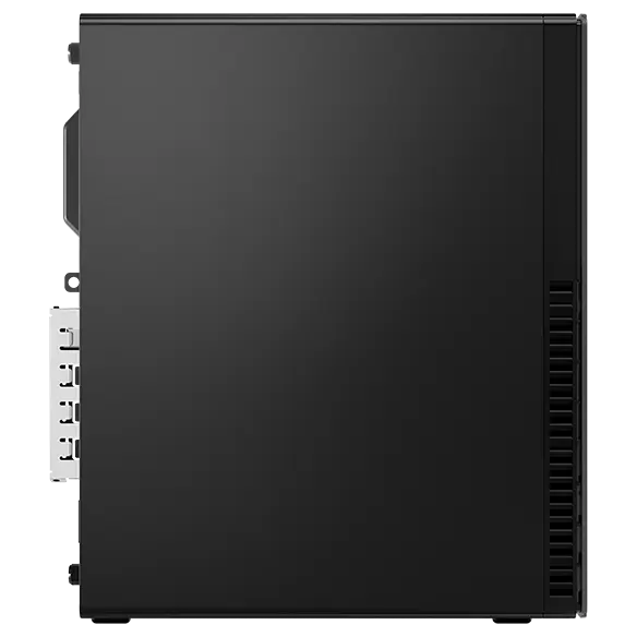 Stasjonær PC med Lenovo ThinkCentre M90s Gen 3 (Intel) og liten formfaktor sett fra høyre, stående vertikalt, viser porter og sidepanel