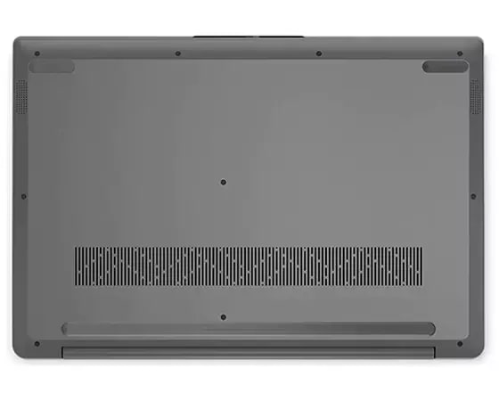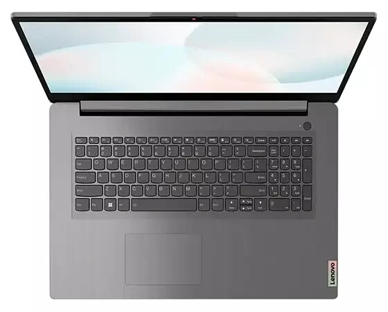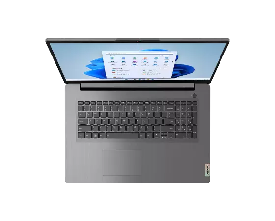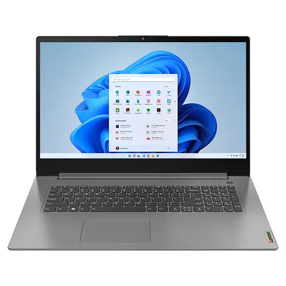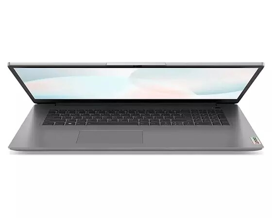 Front facing view of Lenovo IdeaPad 3 Gen 7 17” AMD open 90 degrees, showing keyboard and display screen.