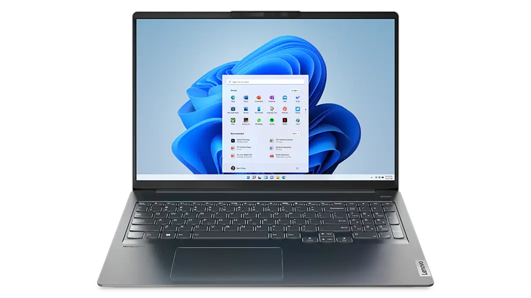 Lenovo IdeaPad 5i Pro Gen 7 laptop showcasing 16″ display with Windows 11 Home and full-sized keyboard with numeric pad.
