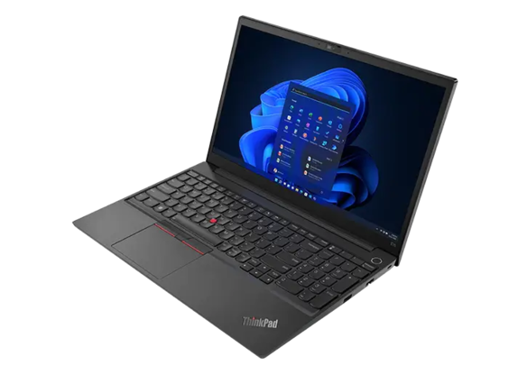 Right side view of Lenovo ThinkPad E15 Gen 4 (15” AMD) laptop, opened, showing display, keyboard, and optional Versa Tray