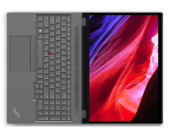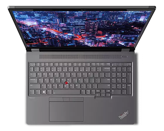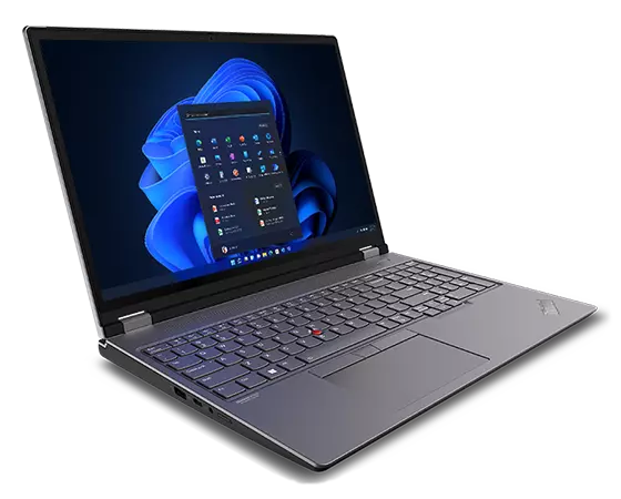 Side--facing Lenovo ThinkPad P16 Gen 2 (16″ Intel) laptop, opened, showing display, Windows 11 screen, keyboard & right-side ports