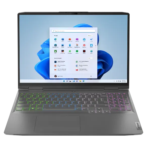 Front-facing view of Lenovo LOQ 16APH8 laptop with display on white-backlit keyboard