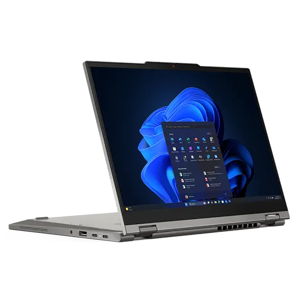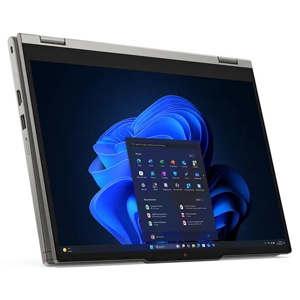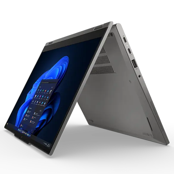 Lenovo ThinkPad L13 2-in-1 Gen 6 (13" AMD) laptop, a flexible touchscreen device placed in presentation mode boasting its versatility & convenience of use, fitting any work setting or mood.