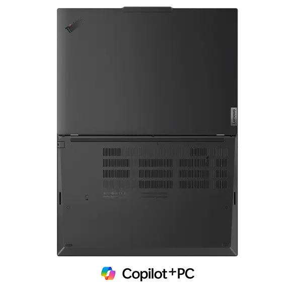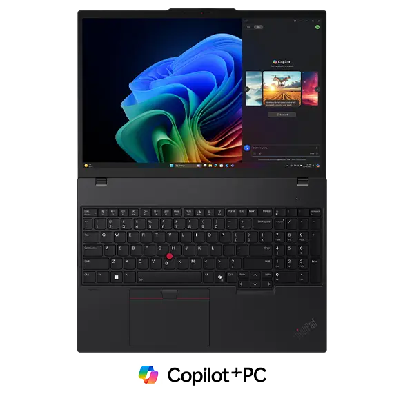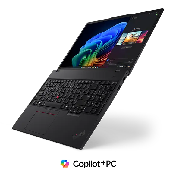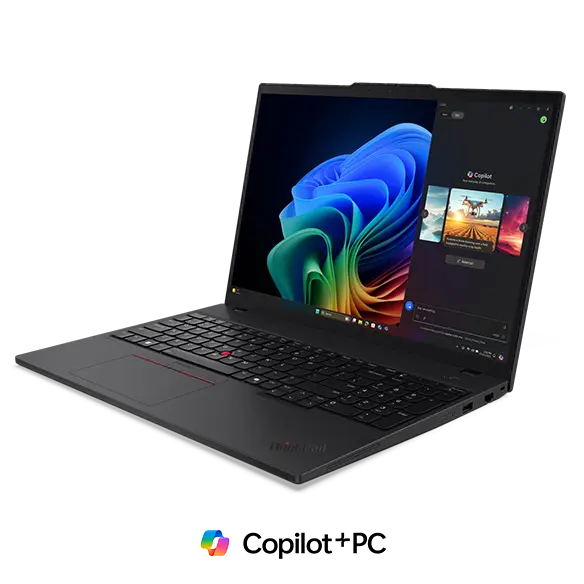 Lenovo ThinkPad T16 Gen 4 (16" Intel) laptop – front view, lid open with Copilot menu against multicolored Windows Bloom background on the display